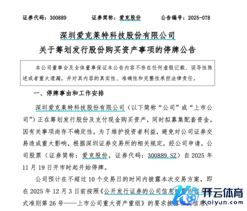 11月18日,爱克股份发布公告称,公司正在霸术刊行股份及支付现款购买财富,同期拟召募配套资金。因相关事项尚存不细目性,为了羡慕投资者利益,幸免对公司证券往复变成要紧影响,经肯求,公司股票自11月19日起停牌。
