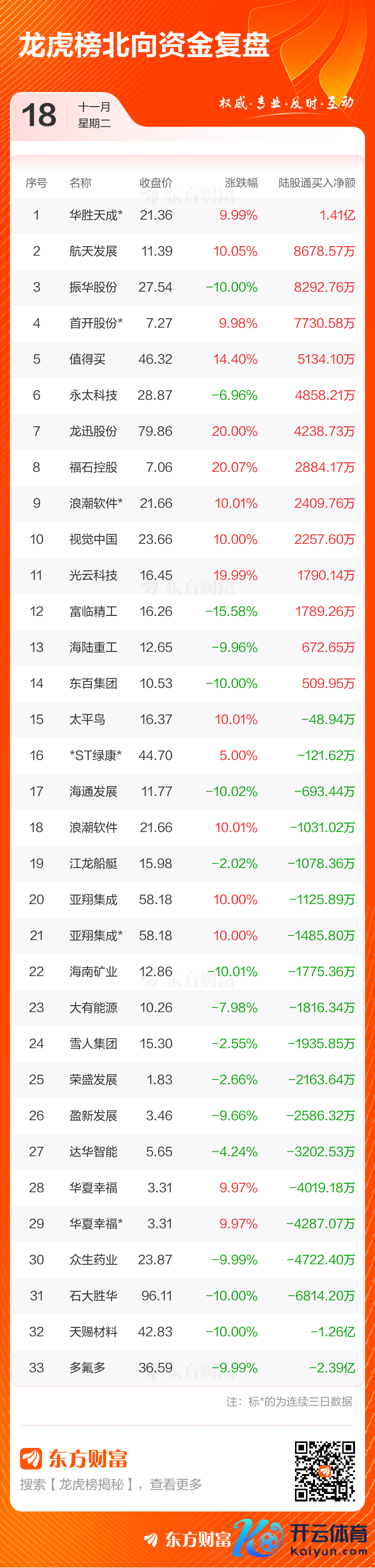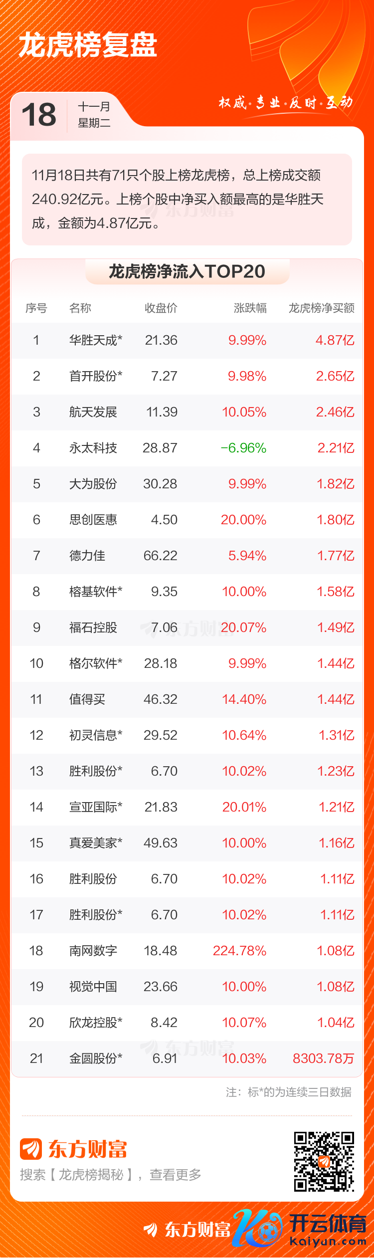 11月18日共有71只个股上榜龙虎榜,总上榜成交额240.92亿元。上榜个股中净买入额最高的是华胜天成,金额为4.87亿元。