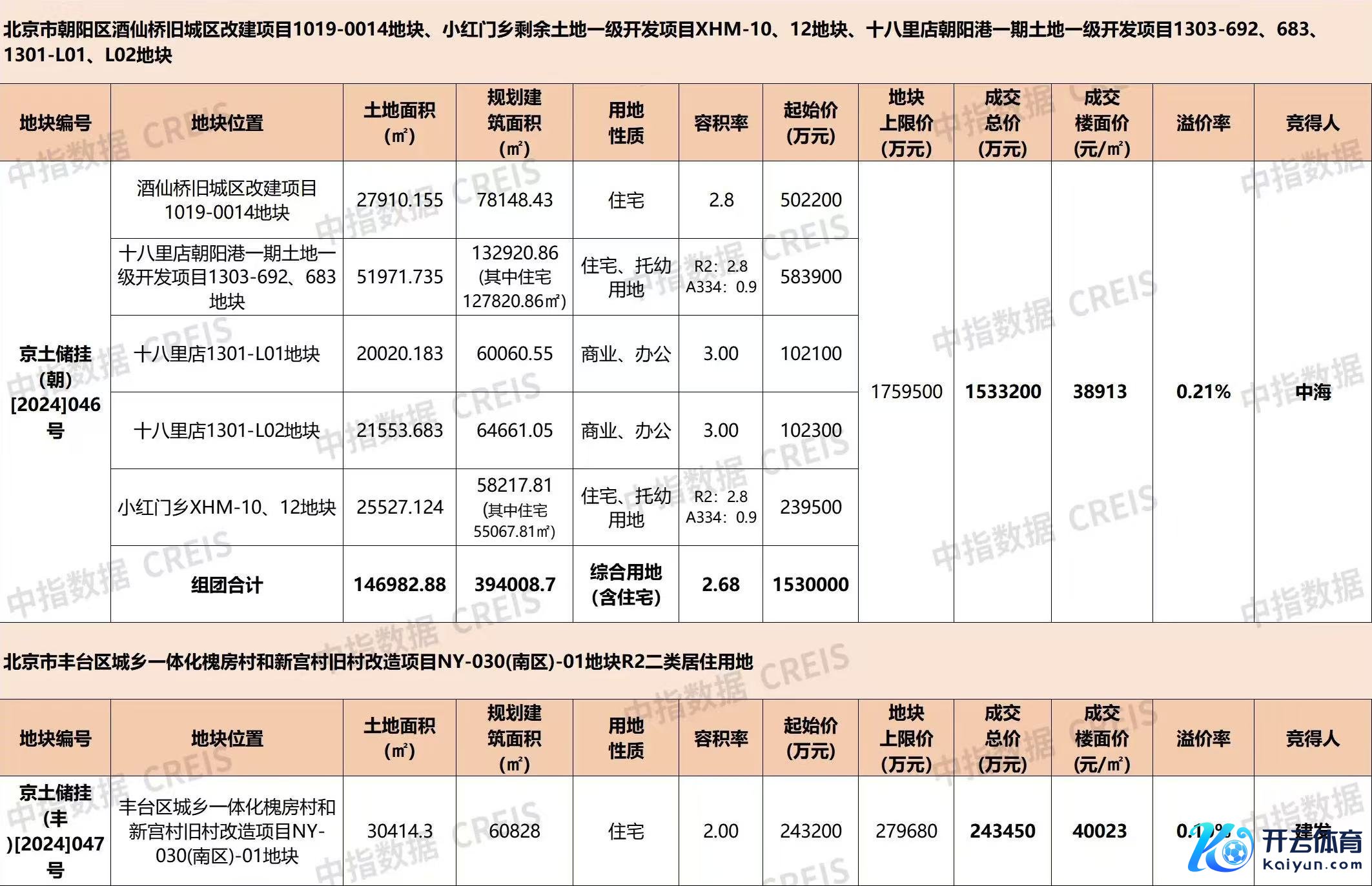 此外当日北京还有一宗地块也进行了出让。地块为丰台区城乡一体化槐房村和新宫村旧村矫正容貌NY-030(南区)-01地块R2二类居住用地,地块“三通一平”,用大地积30414.3泛泛米,经兴建筑面积60828泛泛米,容积率2.0,建筑限高45米(局部60米),肇始价24.32亿元,肇始楼面价39982元/泛泛米,地块上限价27.968亿元,对应溢价率15%,销售疏通价8.3万元/泛泛米(浮动8%)。该地块最终由福州裕诚房地产有限公司以总价24.345亿元竞得该地块,成交楼面价40023元/泛泛米,溢价率0.1%。