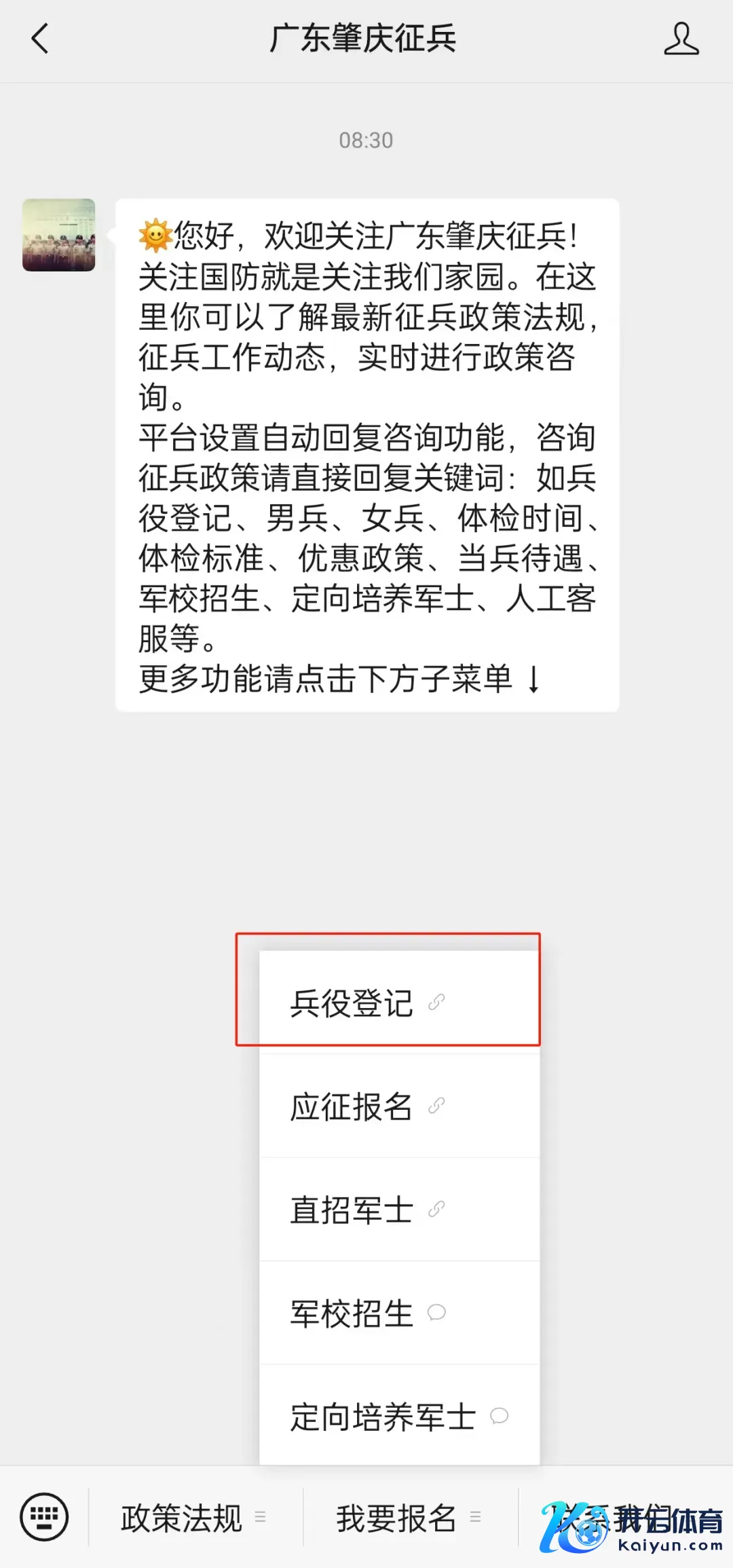眷注“广东肇庆征兵”微信公众号,点击“我要报名”-“兵役登记”,干与兵役登记页面,按照能力教唆进行兵役登记。